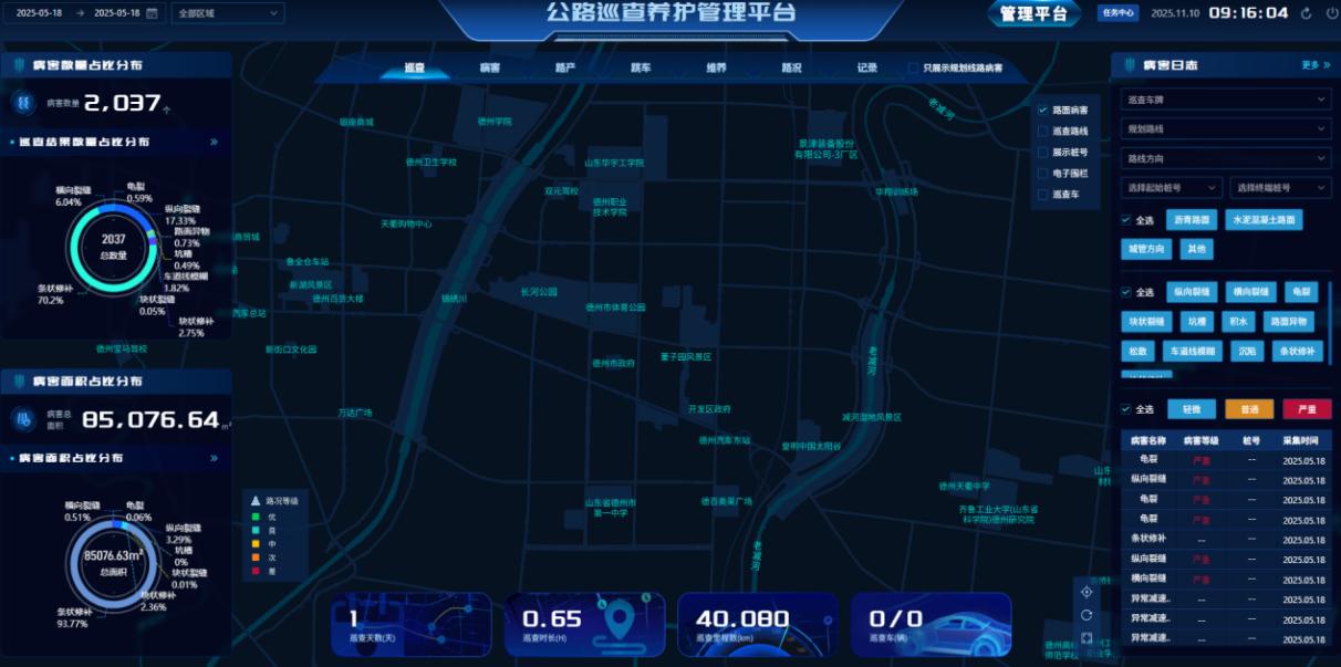 在德州,山东移动借助5G+AI前沿技术,打造“移动智巡”自动化公路巡检系统。单人单车仅用13天即可完成全市1513公里国省道的全面“体检”,巡检效率提升20倍,巡检总成本降低60%。道路巡检系统集成了前视高清摄像机、激光雷达、厘米级定位终端以及后视双目相机,一次外业采集便能同步开展道路病害检测、路测资产清查与道路技术状况评定。目前系统已集成30余种病害识别算法,整体准确率可达95%,已精准发现千余处路面病害以及30处高风险交通标识隐患。这一技术性突破将推动德州公路养护从“粗犷修复”向“精准预防”转变,为京津冀—华东物流通道的安全畅通提供坚实保障。
