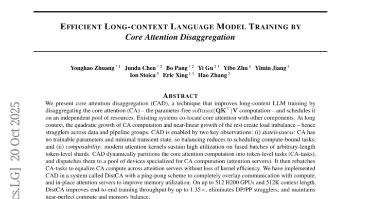 研究团队发现了一个聪明的解决方案,他们提出了一种叫做"核心注意力分离"(Core Attention Disaggregation,简称CAD)的技术。这项技术的核心思想是把最耗费计算资源的"注意力计算"从其他任务中独立出来,就像把工厂里最繁重的工作交给专门的重型设备来处理,而让其他工位专注于各自擅长的任务。研究团队还开发了一个名为DistCA的系统来实现这一技术,在使用512个H200 GPU和512K长度文本的实验中,这个系统将训练速度提升了35%。